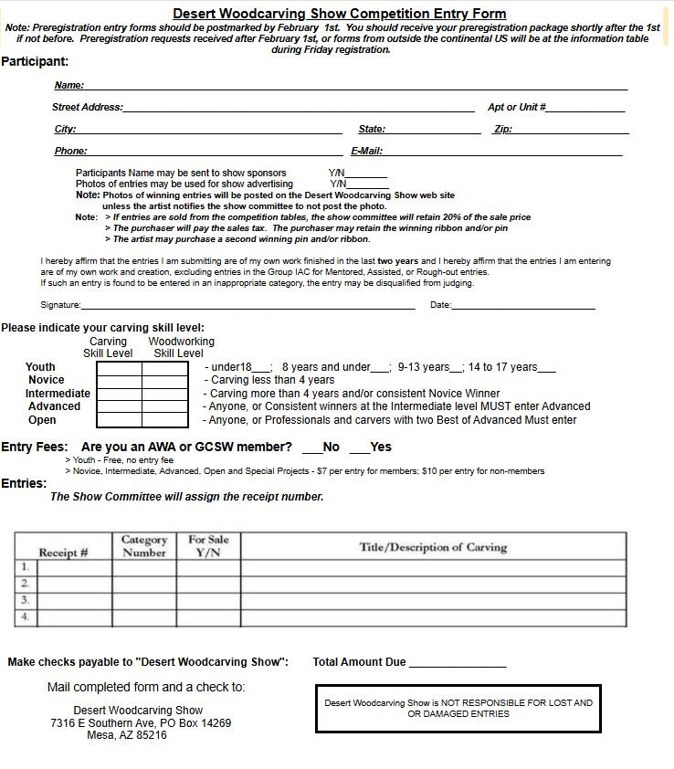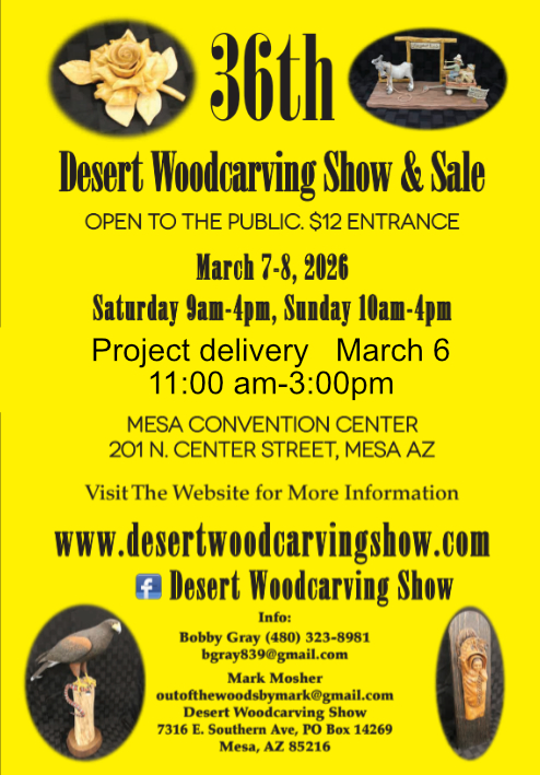 This will be a great show. We are also hosting the AZ Gourd Society’s show, so it will be 2 shows in one. We will have demos, soap carving and a whittling contest. We have venders like Stadtlanders, Moore Wood Products and Buck and Sally’s. There is a concession stand on site. Bob Mau will be our featured carver. Carvings are due Friday March 6 from 11am till 3 pm. See you all there.